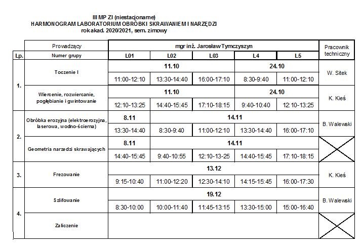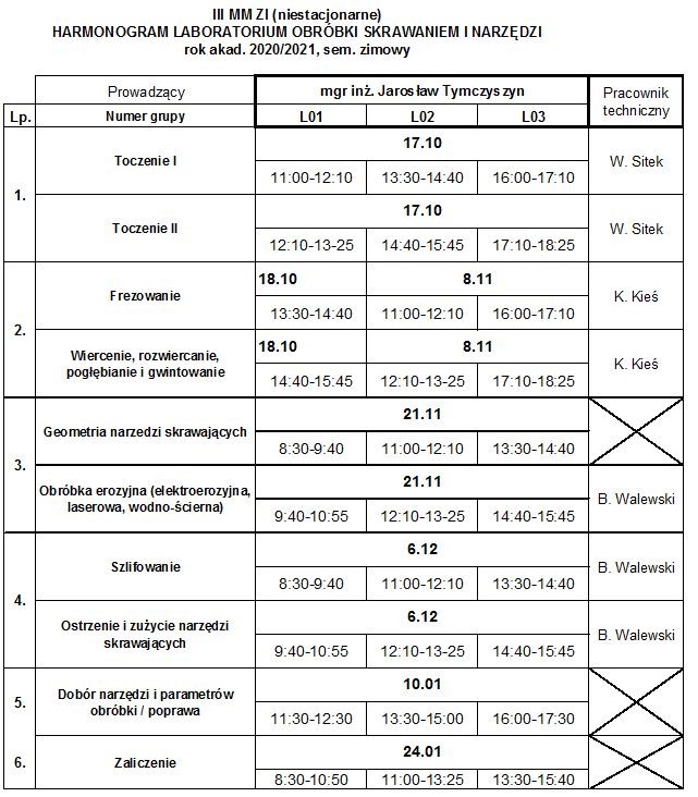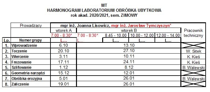 Harmonogram zajęć laboratoryjnych - Obróbka skrawaniem i narzędzia